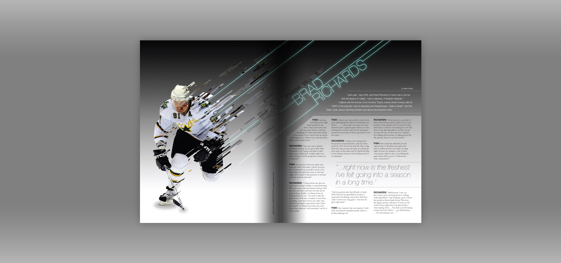 Magazine spread for Replay Sports Monthly on Dallas Stars Brad Richards. I wanted to make the image unique and edgy so I clipped out an image of Brad Richards and in photoshop created an image that shows motion and speed that I feel works for a hockey player rushing down the ice.