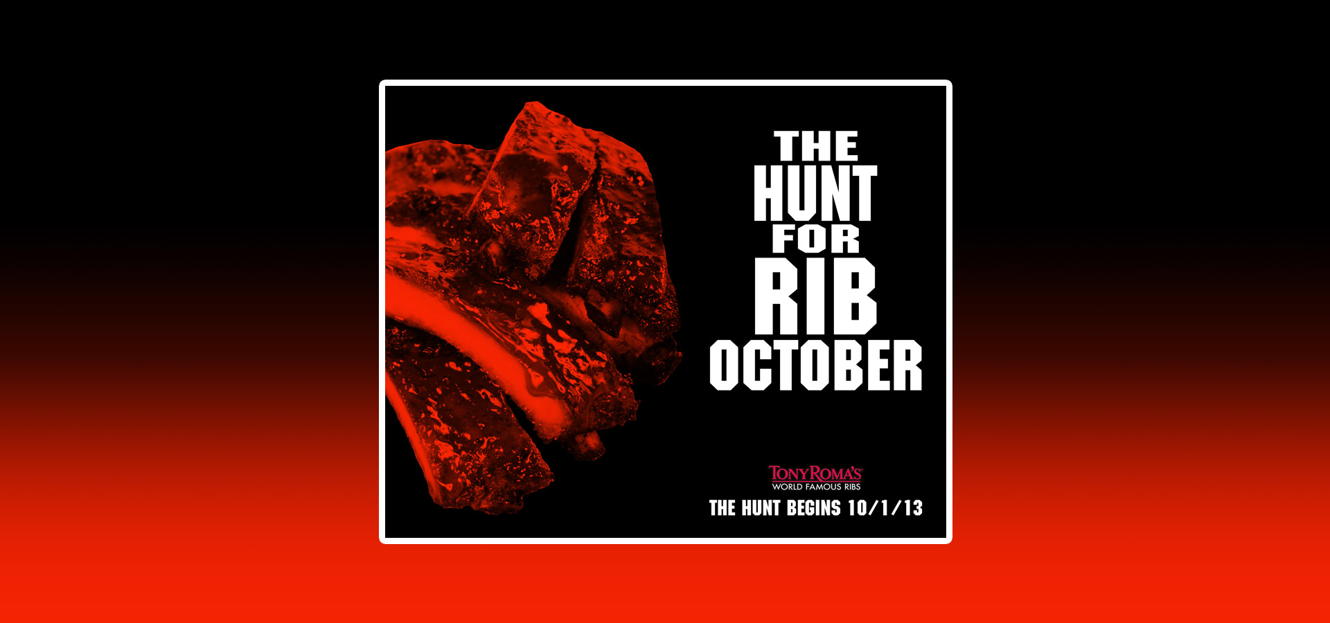To help promote Tony Roma Ribs social platforms and blog a contest was created. The concept was a take on Hunt for Red October and an image was hidden on their blog and Pinterest page. To promote the contest a Facebook tab was created and some other social graphics. In keeping with the concept I made the graphic to resemble the original Hunt for Red October movie poster.